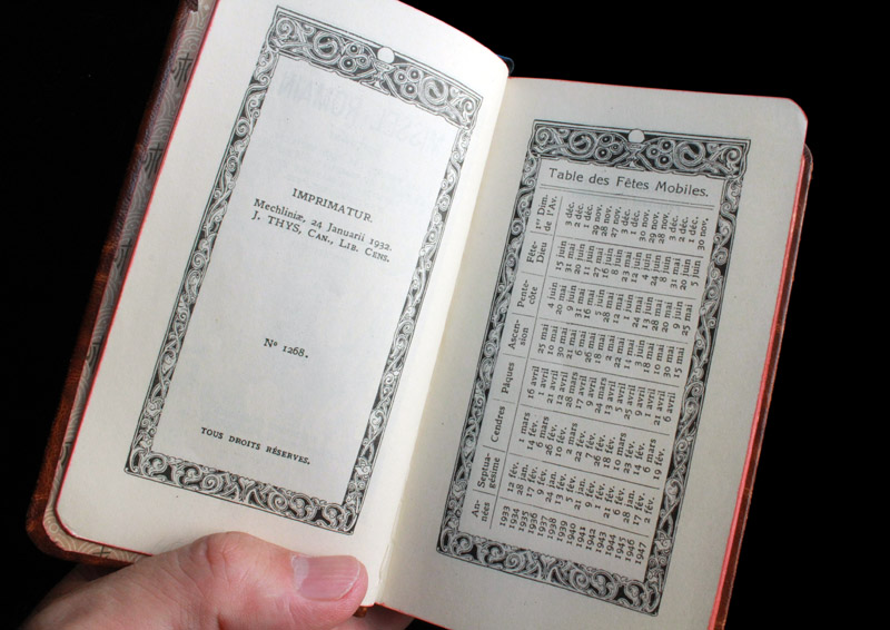 扉に対向するページには、エマオにおいてふたりの弟子に現れた復活のキリスト(ルカ 24: 13 - 35)が描かれています。扉を開けると、1933年から1947年の移動祝日表が現れます。ここから本文手前までの数ページは、アカンサス文とビザンティンの組紐文を折衷したような枠に囲まれています。