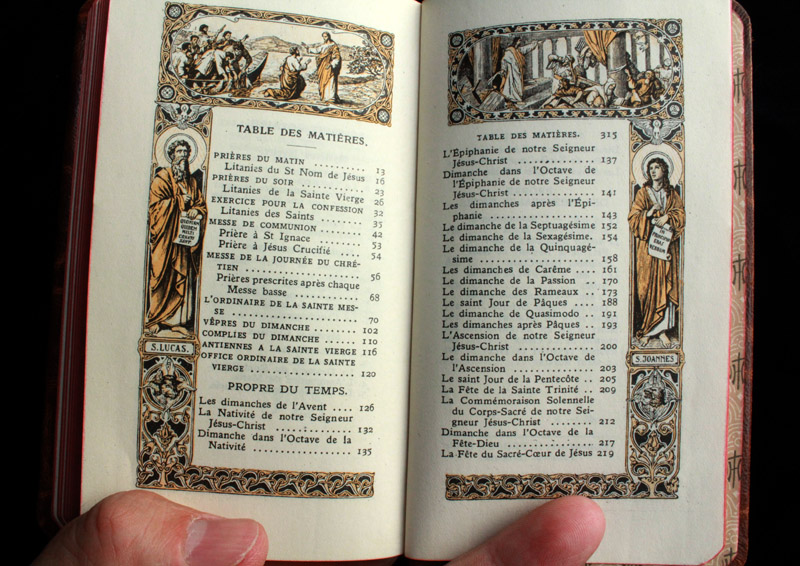 祈祷書本文はラテン語とフランス語で書かれ、四人の福音記者マタイ、マルコ、ルカ、ヨハネと、それぞれの福音記者を象徴するテトラモルフ(人間、ライオン、牛、鷲)、及びイエズスの公生涯の出来事(エルサレム入城、山上の垂訓、ペトロの召命、宮清め)を描いた絵に、各ページが囲われています。福音記者が持つ巻き物には、それぞれの福音書の冒頭部分がラテン語で記されています。