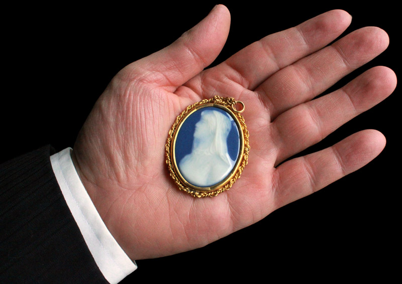 本品は一見したところジャスパーウェアにも似ていますが、少女を表した白色磁器の層は非常に薄く、ジャスパーウェアのように別作の部品を貼り付けたのではないことが分かります。これは高級磁器に施される「パート=シュル=パート」と呼ばれる高度な技法で、あまりにも手間がかかるゆえに、現在では制作されなくなっています。