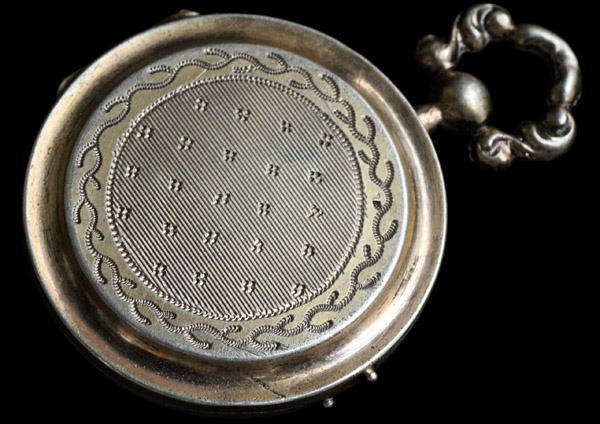 両面の意匠は同じで、いずれの面にも手作業による丁寧な彫金細工が施されています。平行線で埋めた中央部分には、四個一組の多数の点が規則正しく配列されています。四個一組の点は、一見したところ十字架あるいはフルール・ド・リスのように見えます。図像の背景に十字架やフルールドリスを散らすのは、フランスの伝統的意匠です。