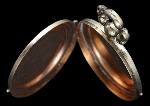 メダイヨンは蝶番(ちょうつがい)式で大きく開き、どちらの面にも絵や写真を入れることができます。本品は 5.7ミリメートルの厚みがありますので、絵や写真の代わりに小さな物品を入れることも可能です。メダイヨンはきちんと閉まり、勝手に開くことはありません。蝶番にも緩みはありません。