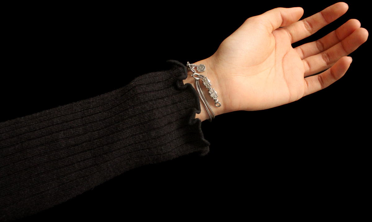 上の写真は女性モデルによる着用例で、引き環と反対側の端にコマ二個を移動させ、その手前に引き環を掛けています。この状態の有効長は 17.5センチメートルです。
