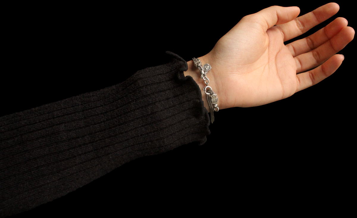 百年以上前のフランスで制作された銀製ブレスレット。組紐状チェーンの両端に被さる金具のそれぞれ、及び引き環の基部を合わせた三か所に、テト・ド・サングリエ(仏 la tête de sanglier イノシシの頭)が刻印されています。