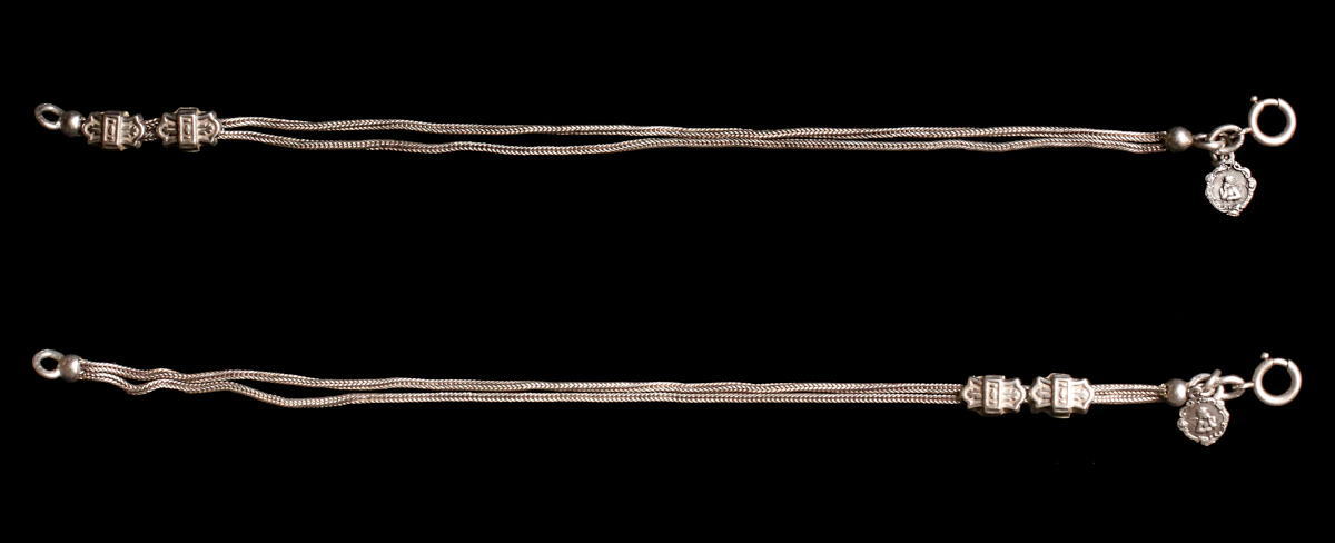 フランスをはじめ第一次世界大戦前のヨーロッパでは、富の大半が富裕層に集中していました。たとえば 1910年のフランスにおいて、上位 1パーセントの富裕層が富の70パーセント近くを所有していました。富裕層の範囲を上位10パーセントに広げると、この階層が富の九割を独占し、残りの一割を90パーセントの国民が分け合う状況でした。「一部の富裕層以外は、全員が下層階級」というように、社会が極端に二極分化していたのです。このような時代に作られた銀無垢のブレスレットは大多数の人々にとってたいへん高価であり、日常的に購入できる品物ではありませんでした。本品は人生の大きな節目にふさわしいジュエリーであり、筆者(広川)が推測するに、おそらく初聖体またはコミュニオン・ソラネルの記念品ではないかと思います。