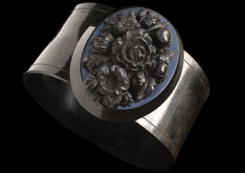 美しい草花の意匠で作られたモーニング・ジュエリー。1880年頃のイギリスで、エボナイト(ヴァルカナイト)により制作された品物で、カメオ様(よう)の作品をネジでバンドに固定して、ブレスレットとしています。