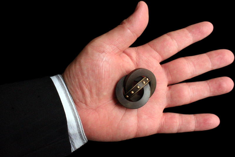 「ラヴ・ノット」はセンティメンタル・ジュエリーによく採用されるモティーフですが、センティメンタル・ジュエリーがジェット製の場合はもっと単純かつ平坦な意匠となり、本品のように造形することは不可能です。仮にこの意匠のジェット製品を作ったとしても、きわめて破損しやすく、現代まで残るとは考えられません。しかしながら本品はエボナイト製であるゆえに非常に立体的な意匠が可能であり、さらに今日まで良い状態で残っています。エボナイトはジェットよりも安価な模造石と認識されていますが、本品のようにジェットで作れない意匠を実現した作例においては、単なる模造石を超えて、優れた工芸材料としての価値を獲得しています。