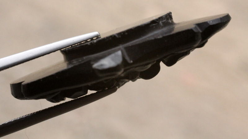 裏面の突出部分を横から見ると台形になっています。「ジェ・ド・パリ」のセンターピースは金属製の台に嵌め込まれることが多くありました。針金細工や磁器、エポキシ樹脂等で台を作れば、オリジナルのビジュ(bijou ジュエリー)を自作できます。