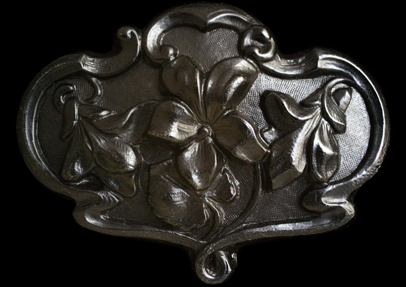 植物的な曲線と左右非対称の意匠によるアール・ヌーヴォーのガラス製品。センチメンタル・ジュエリーのセンター・ピースとして百年以上前にフランスで作られた立体的な作品ですが、製品にならないまま未使用の状態で残っています。