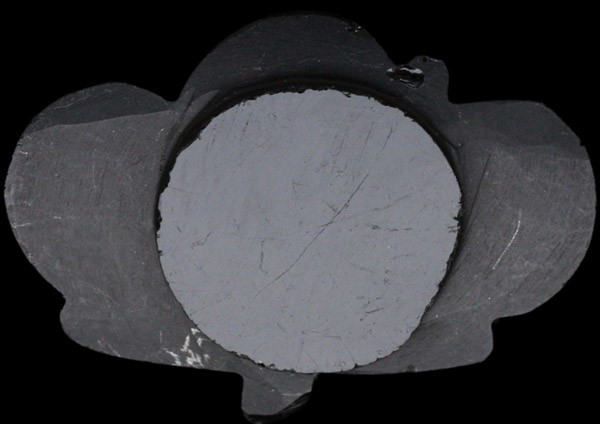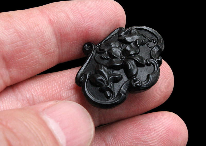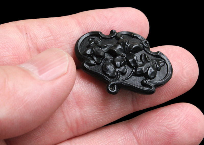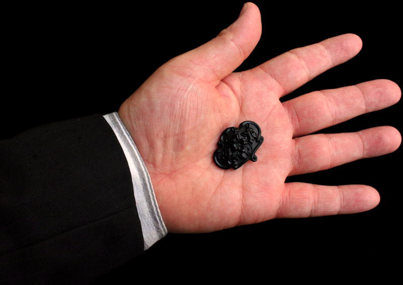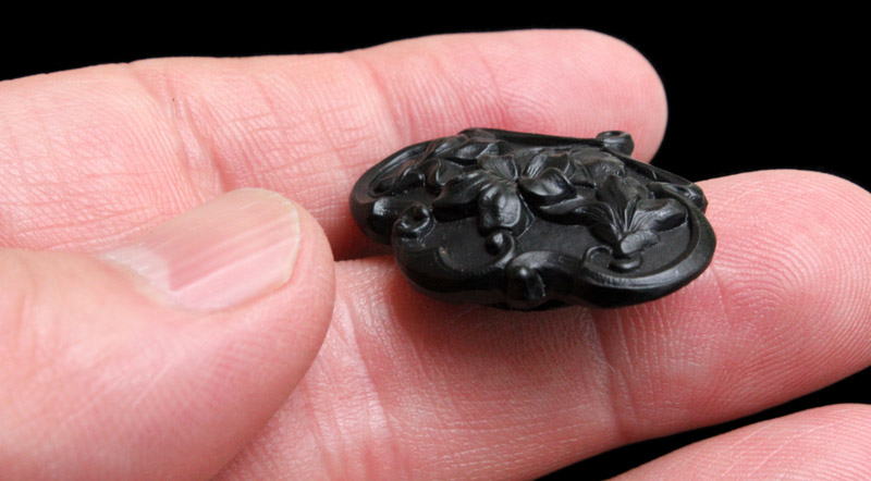 本品の材質は酸化銅、コバルト、鉄を加えた漆黒の不透明ガラスで、ジェット(漆黒の褐炭)を模しています。ジェットを模したこのようなガラスを「ジェ・ド・パリ」(jais