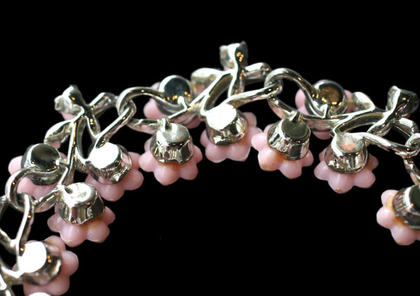 金属部分の色はシルバでー、ピンクのプラスティックでかたどった直径1センチメートル弱の小花と球形のつぼみがたくさん散りばめてあります。