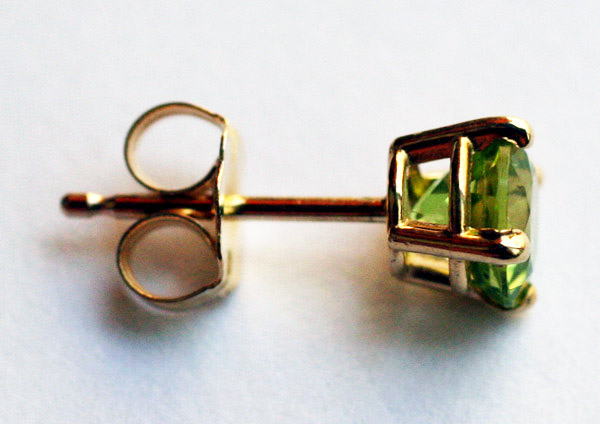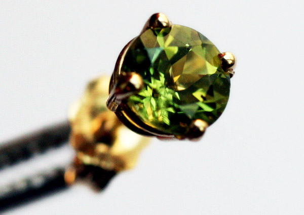 良質のペリドットで制作した片方のみのピアス式イアリング。ペリドットの直径は 5.2ミリメートルで、色、クラリティ、カットとも優れており、キラキラとよく光ります。ナット(ポストの留め金)を含め、金属部分は全て十四カラット・イエロー・ゴールドです。この商品の仕上がり価格(宝石、枠、工賃すべて込み)は