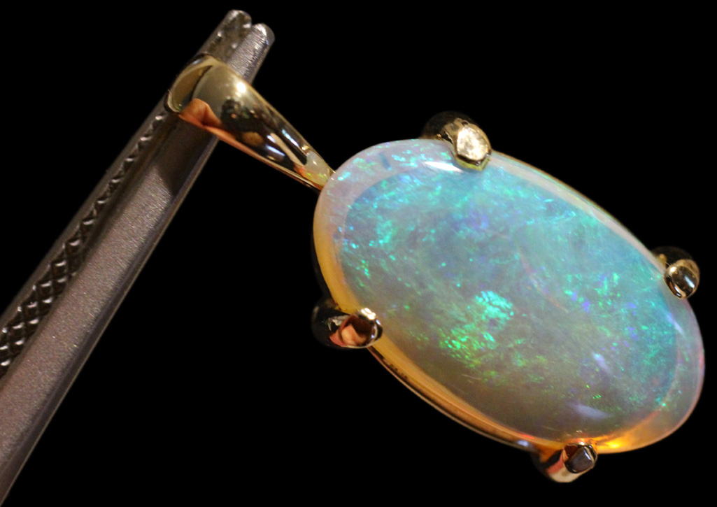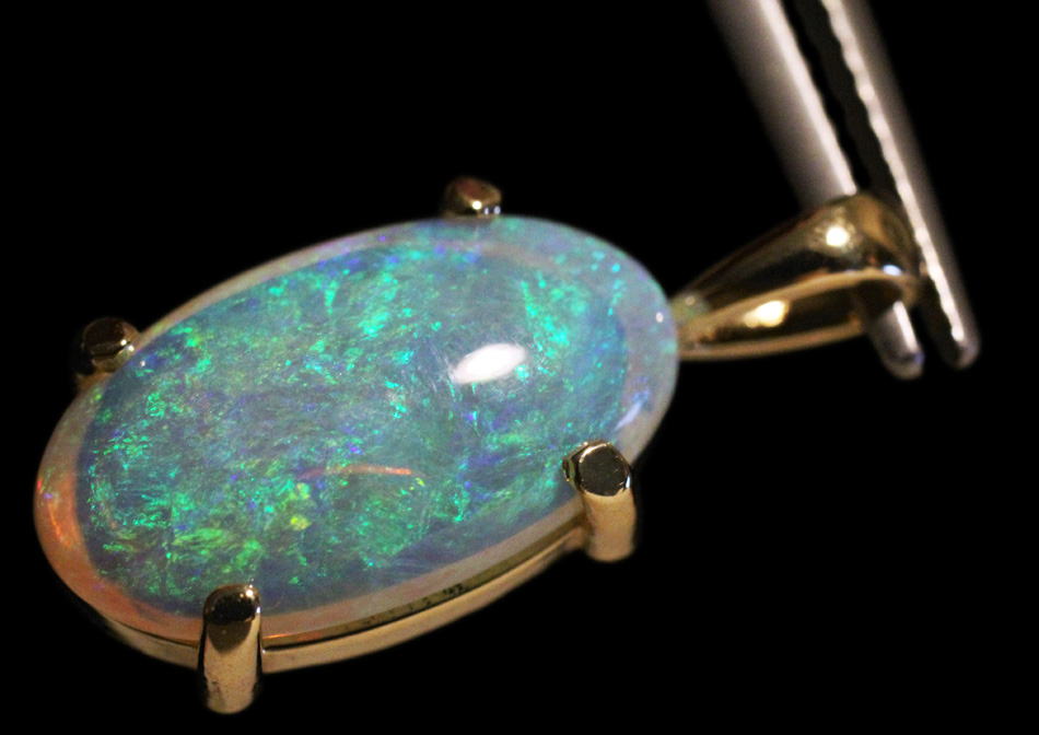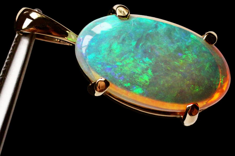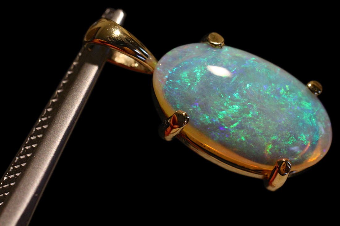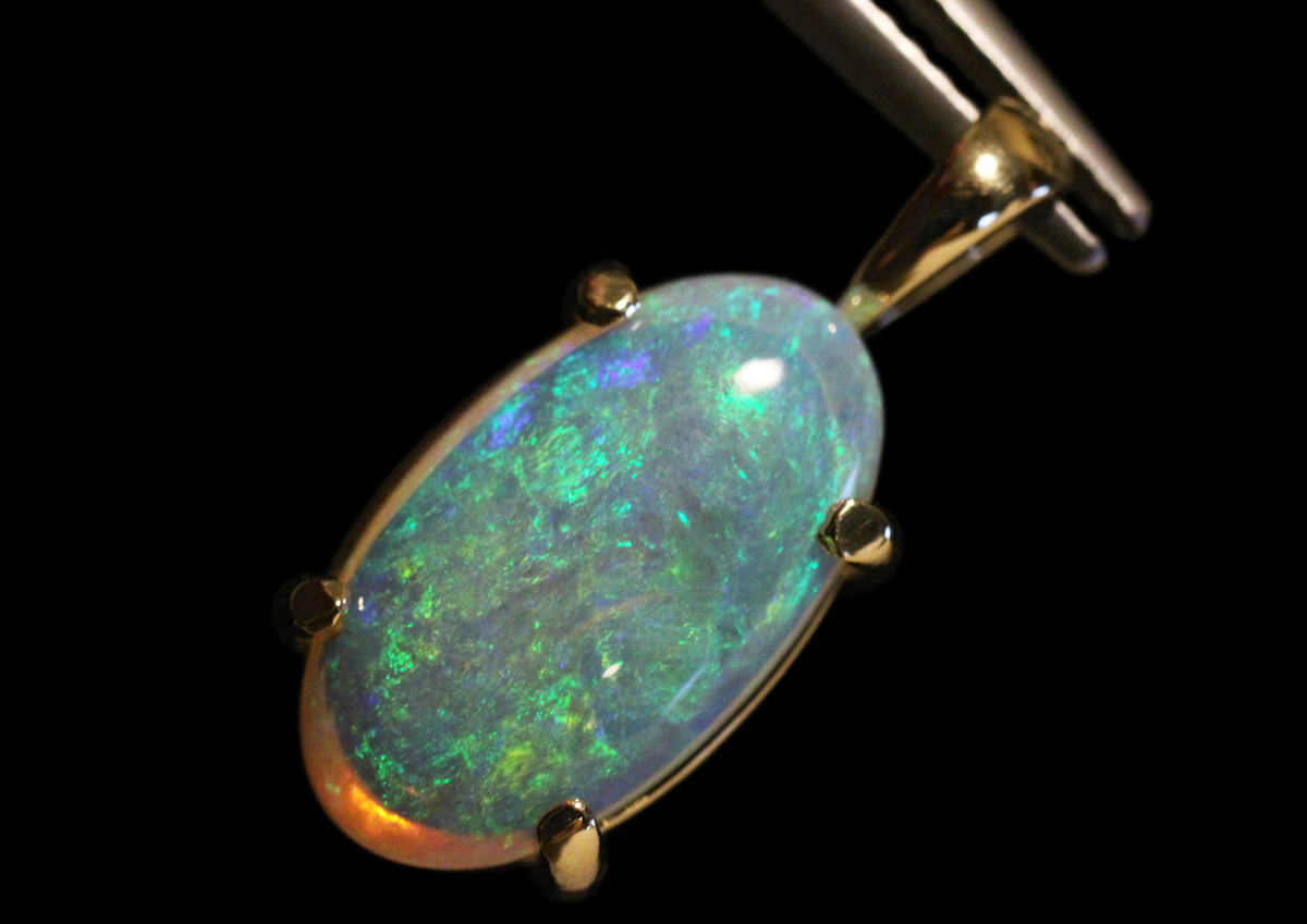 ブルーとグリーンの遊色効果が美しいオーストラリア産オパールの逸品。張り合わせ石ではありません。本品は稀な美石で、青から緑のシンチレーションを有します。チカチカと明滅する光の粉は陽光に煌めく珊瑚海のようで、宇宙に浮かぶ地球の青さをも思い起こさせます。
