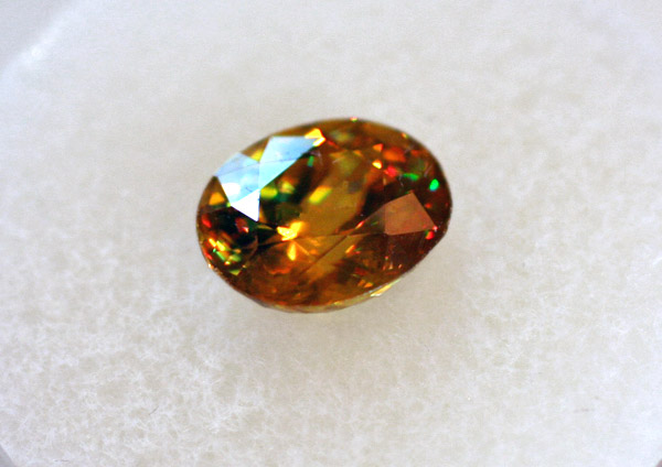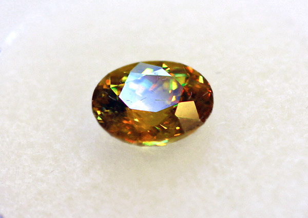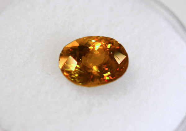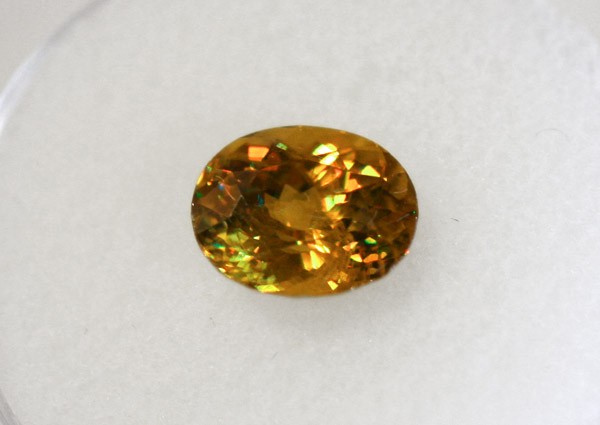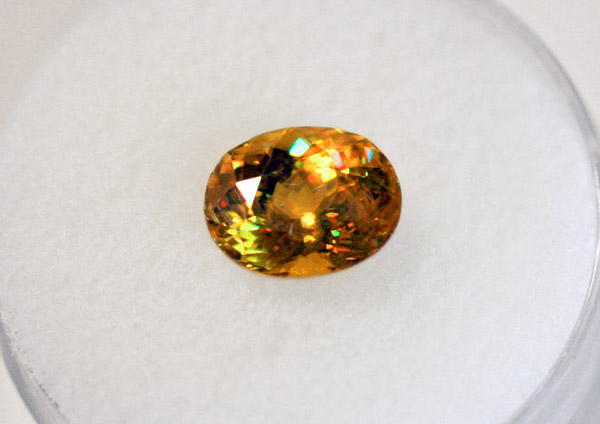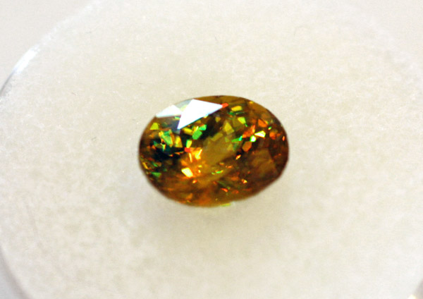 色とりどりの光の粒を撒き散らすスリ・ランカ産スフェーン。ファセットの数が多いポーテュギーズ・カットを施されているせいで、いっそう華やかなファイアを楽しめます。