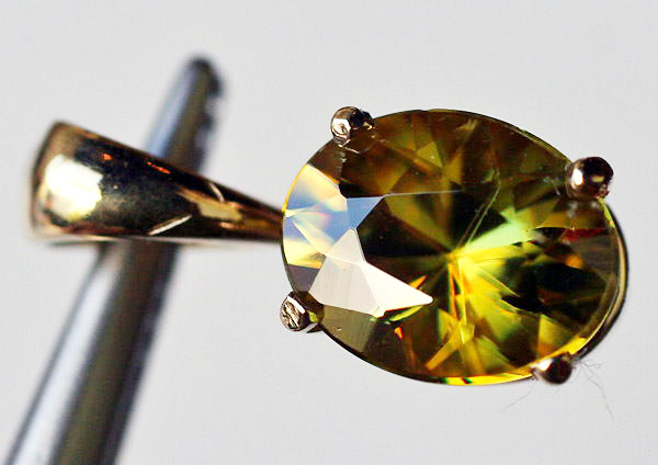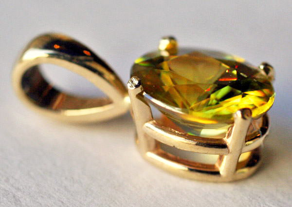 8.1 x 6.3ミリメートルで、それほど大きな石ではありませんが、この宝石特有の分散(ファイア)のせいで、上品でありながらも目を惹くジュエリーになりました。スフェーンの強烈なファイアは、写真で再現できません。ペンダントの仕上がり品の価格(石、枠、工賃すべて込み)は