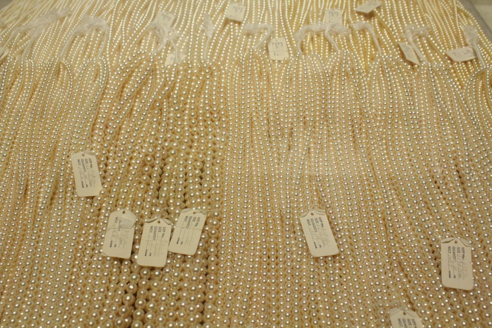 (上) 業者向けに卸売りされる首飾り用の真珠。これらの真珠は漂白済みですが、少し黄色味が残っています。