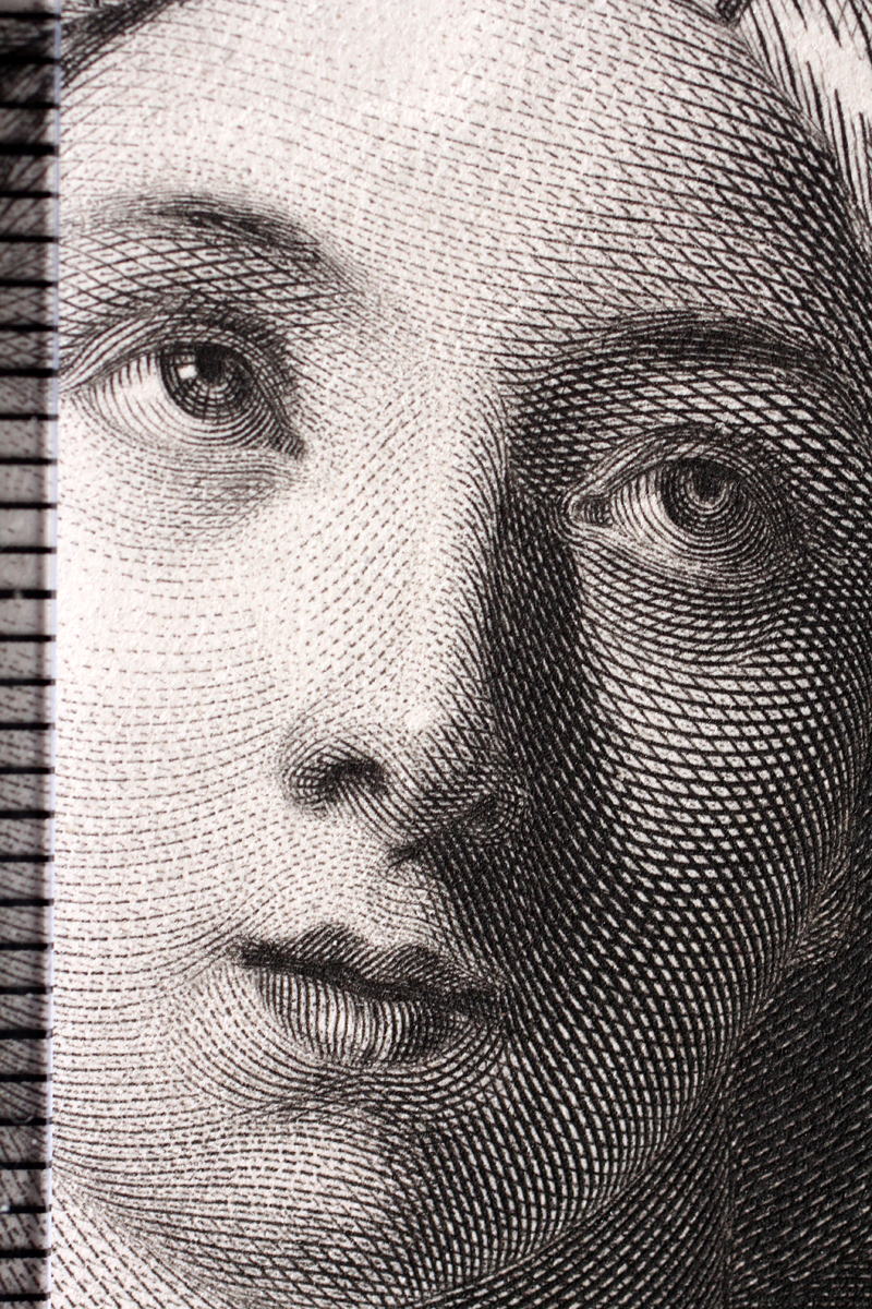 これらに比べて格段に技術と労力を必要とするのはグラヴュール(エングレーヴィング)です。グラヴュールにおいては金属を酸で腐蝕させるのではなく、ビュラン(グレイヴァー、彫刻刀)を使って、人間の力で金属板にインク溝を刻んでゆきます。刷りあがった画面の明るい部分にあたる溝には破線、暗い部分は途切れの無い線が刻まれ、特に暗い部分ではクロスハッチでできる菱形の内部に点を刻んでいます。またそれぞれの線の幅と深さを調節することによって、溝に入るインクの量が適正になるように計算し尽くされています。