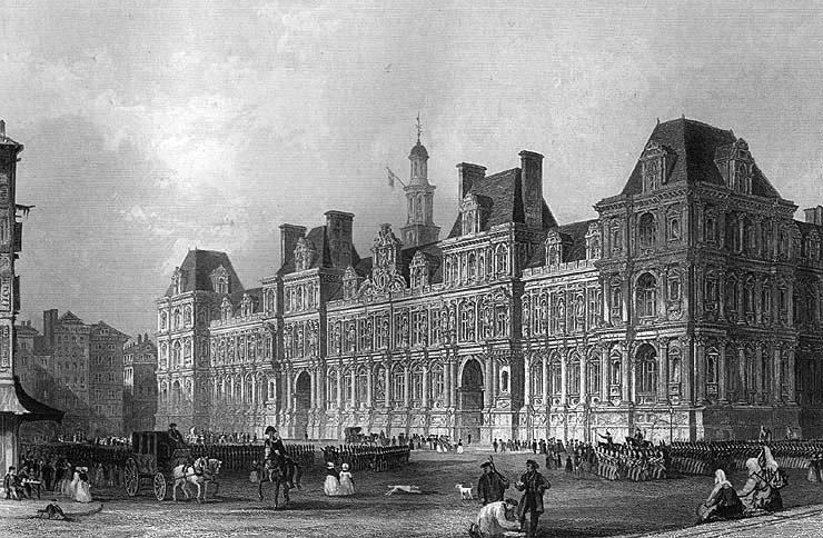 パリ市役所の本格的な建物はフランソワ1世が建設を命じ(1533年)、 ルイ13世の治世に完成しました(1628年)。1835年にはこの建物に両翼が付け加えられました。旧市役所はルネサンス様式の美しい建物でしたが、パリ・コミューン(1871年)の混乱のなかで火を放たれて、テュイルリー宮、会計検査院とともに焼け落ちました。市役所は8日間燃え続けたそうです。