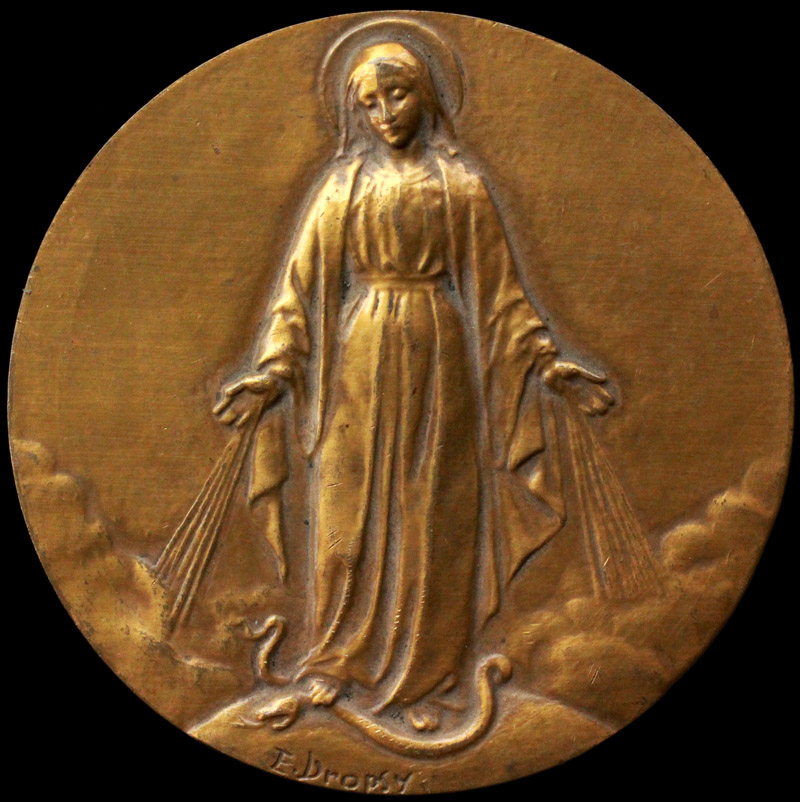 19世紀後半から20世紀前半のフランス・メダイユ彫刻を代表する彫刻家のひとり、エミール・ドロプシ (Jean-Baptiste Émile Dropsy, 1848 - 1923) による青銅(ブロンズ)製円形メダイユ。無原罪の御宿りなる聖母は球体上に蛇を踏みつけて立ち、両腕を少し広げて斜め下に伸ばしています。掌は前に向けられて見る者を招き、両手からは恩寵の光が発出しています。メダイユの下端に、エミール・ドロプシのサイン (E. Dropsy) が刻まれています。