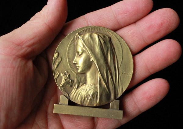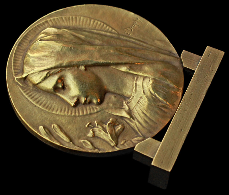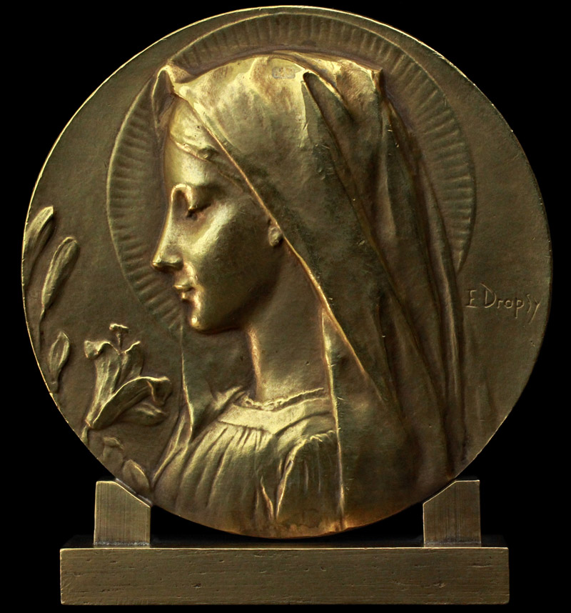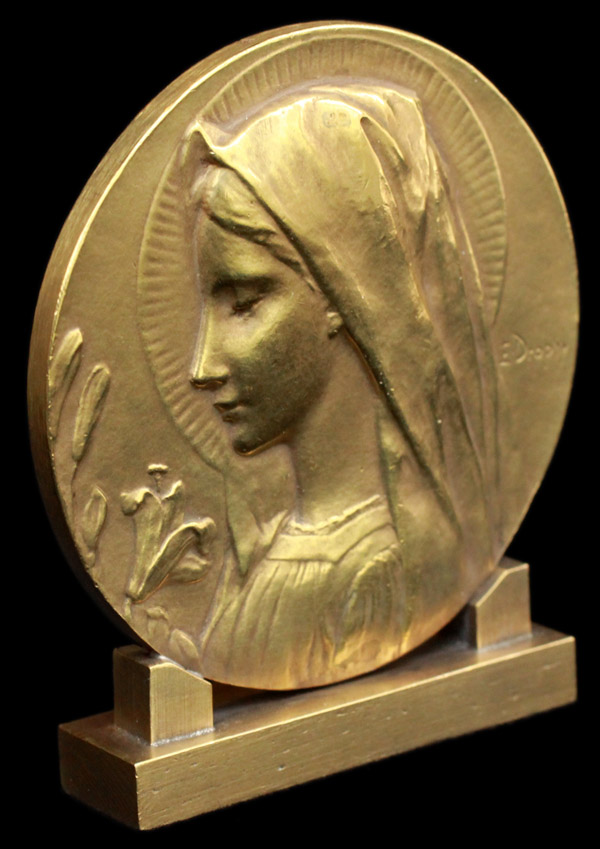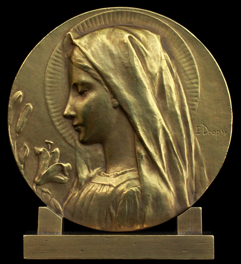 Émile Dropsy, 1848 - 1923) による青銅(ブロンズ)製の自立式メダイユ。円形の画面いっぱいに聖母マリアの横顔を浮き彫りにした大胆な構図で、マリアは花嫁のヴェールを被り、白百合を前に微笑みを浮かべています。