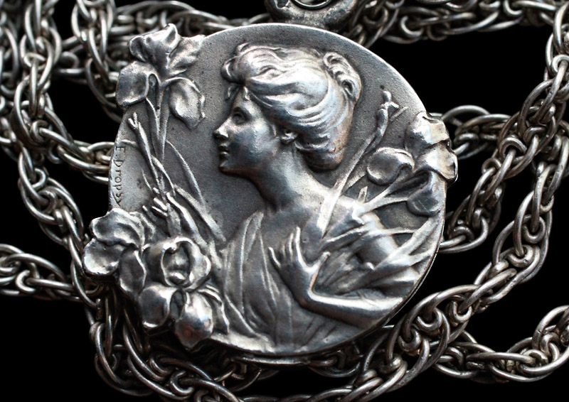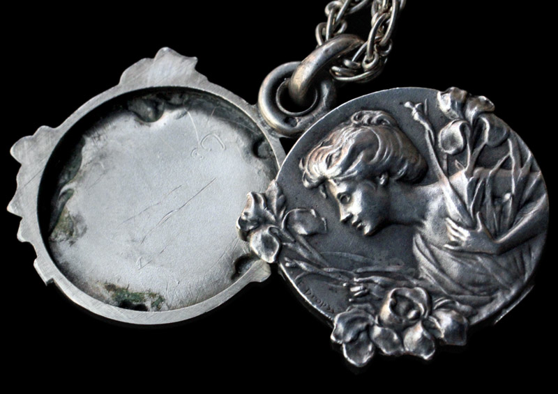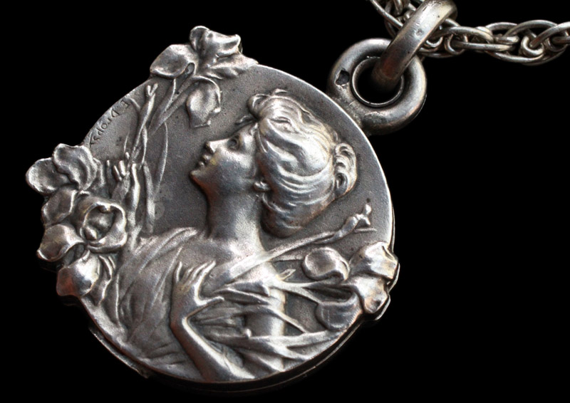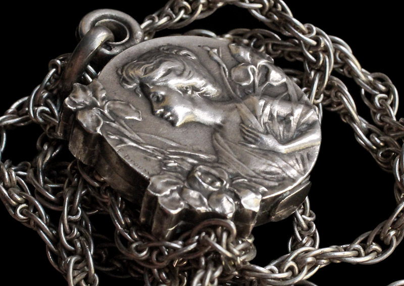 19世紀後半から20世紀前半のフランス・メダイユ彫刻を代表する彫刻家のひとり、エミール・ドロプシ (Jean-Baptiste Émile Dropsy, 1848 - 1923) による美麗なメダイヨン(ロケット)。典雅なアール・ヌーヴォー様式に基づき、800シルバーで制作した銀無垢の高級品で、フランスにおいて800シルバー(純度 800/1000の銀)を示す「イノシシの頭」のホールマークが、上部の環に刻印されています。