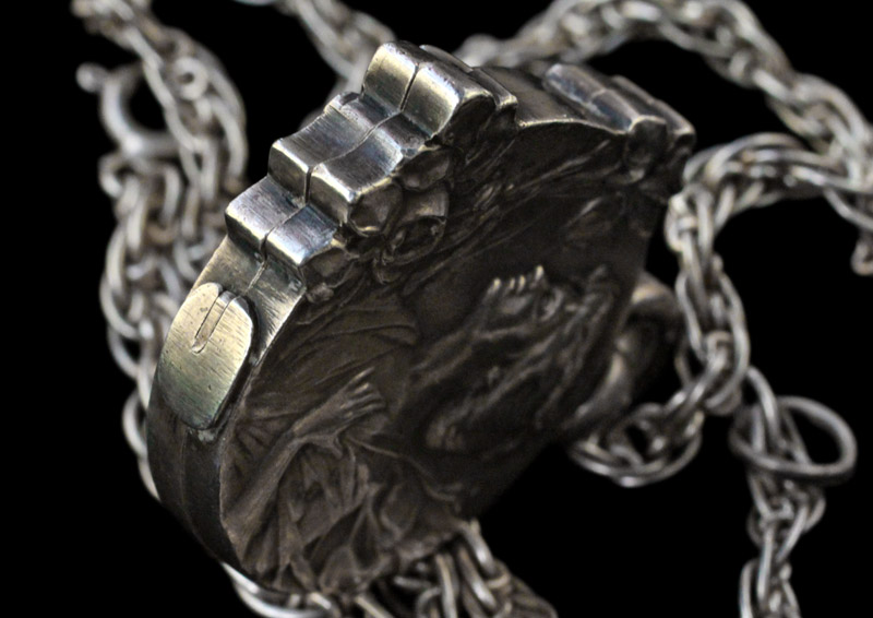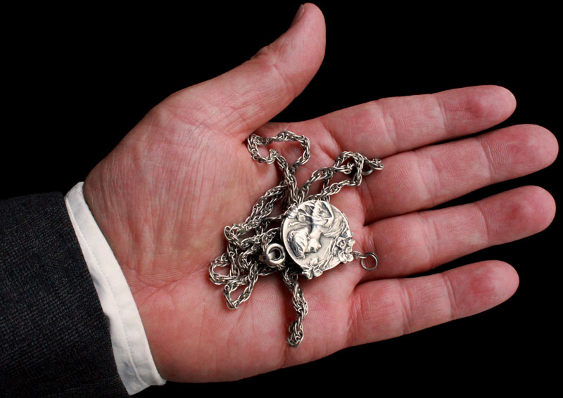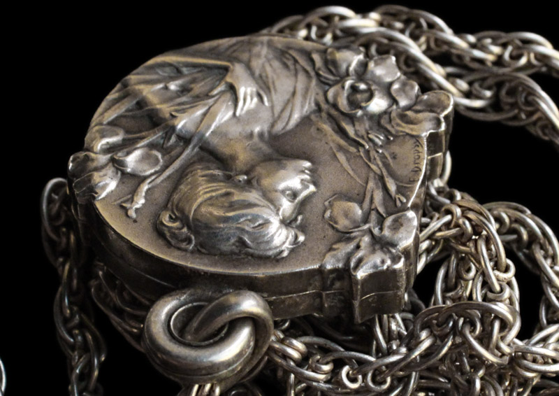 昔のフランスでは多くの人がメダイヨン(ロケット)を愛用し、アンティーク工芸品にもメダイヨンは多く見られます。大抵の場合、この時代のメダイヨンはごく薄い銀板を使用し、「打刻」の一種である「打ち出し」の技法によって効率的に制作されています。しかしながら本品はたいへん手間がかかる「鋳造」により、本格的な美術工芸品として制作されており、アンティーク・メダイヨンのなかでも最も高級な水準の品物であることがわかります。