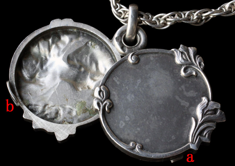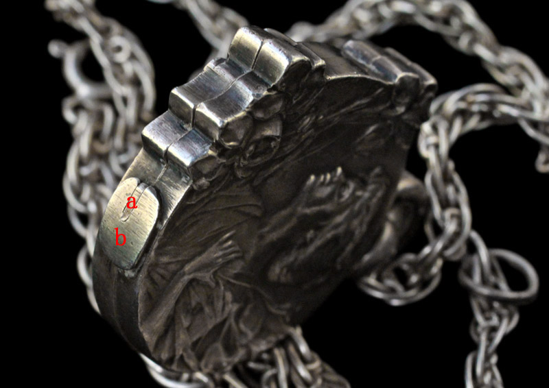 本品は銀が分厚いだけでなく、スライドさせてメダイヨンを閉じたとき、身あるいは裏蓋側の小突起 (a) が、女神が彫られている側から出た突起 (b) の溝に嵌まり込んで、しっかりと固定される方式になっています。
