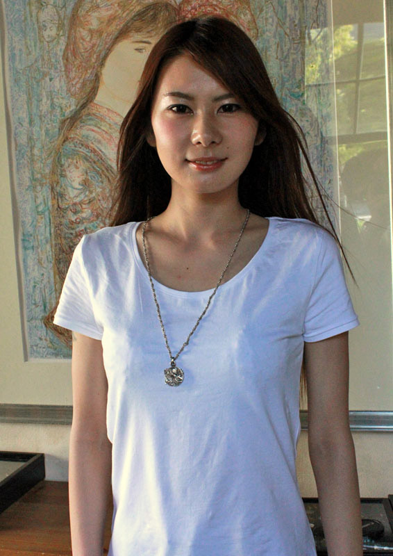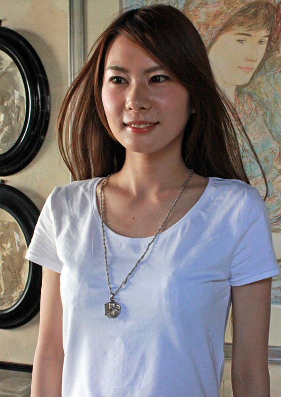 下の写真は70センチメートルのチェーンを付けて撮影しました。このチェーンは上の商品写真の一部にも写っていますが、モデルを使った撮影用に仮に取り付けた別売り商品です。このメダイヨンをペンダントとして着用される際は、40センチメートル、45センチメートル、50センチメートルなど、お手持ちのチェーンをお使いいただけます。