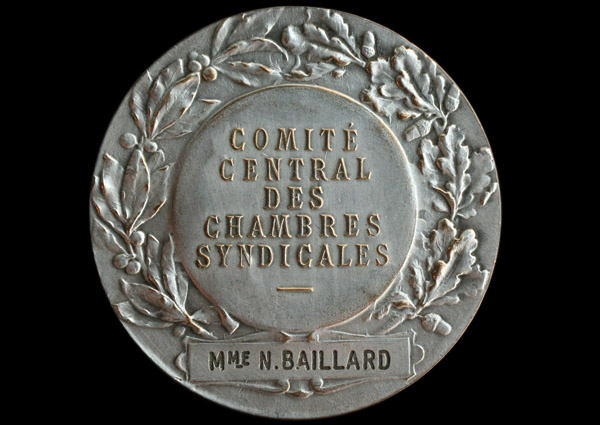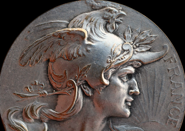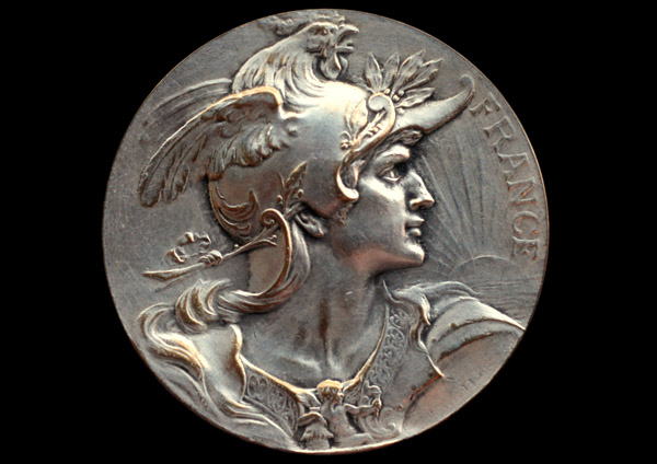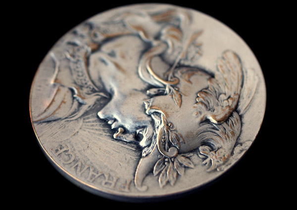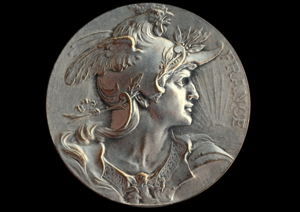 フランス国家を擬人化した女性マリアンヌあるいはミネルヴァの横顔と、フランス民族の象徴であるル・コック・ゴーロワ(ガリアの雄鶏)を表したメダイユ。銀めっきを施したブロンズを用いて、アール・ヌーヴォー様式で制作されています。直径約41ミリメートル、厚さ約4ミリメートルという立派なサイズの工芸品で、手に取るとずしりとした重みを感じます。