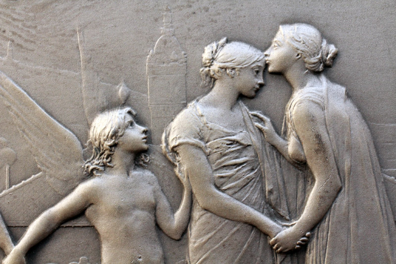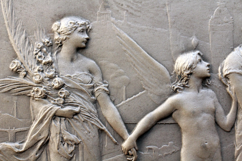 プラケットの表(おもて)面には、鉄道の操車場と近代的な街並みを背景に、三人の女性と、その間に立つひとりの少年が浮き彫りにされています。