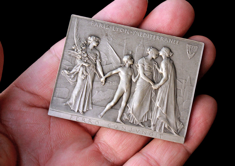 当時のメダイユ、プラケットの素材は、ブロンズ、あるいはブロンズに銀めっきを掛けたものが普通です。本品「鉄路は結ぶ」は制作数が少なく、たいへん珍しいものですが、もし入手できてもブロンズ製のものがほとんどで、銀製はとりわけ稀少です。銀でできた本品は、おそらく大株主用に特別に鋳造された作品であろうと思われます。