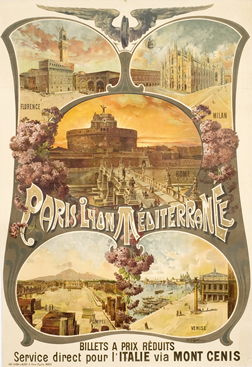(下・参考画像) 「翼がある車輪」が上部に描かれた「パリ・リヨン・地中海鉄道」のポスター。1895年
