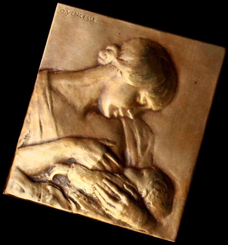 母乳を飲みながら眠りかけている赤ん坊と、我が子を慈しむ若き母を浮き彫りにしたブロンズ製メダイユ。母子に通う愛情を好んで描き、数々の優れた作品を遺したディジョンのメダイユ彫刻家、オヴィド・ヤンセス (Ovide Yencesse, 1869 - 1947) の作品です。