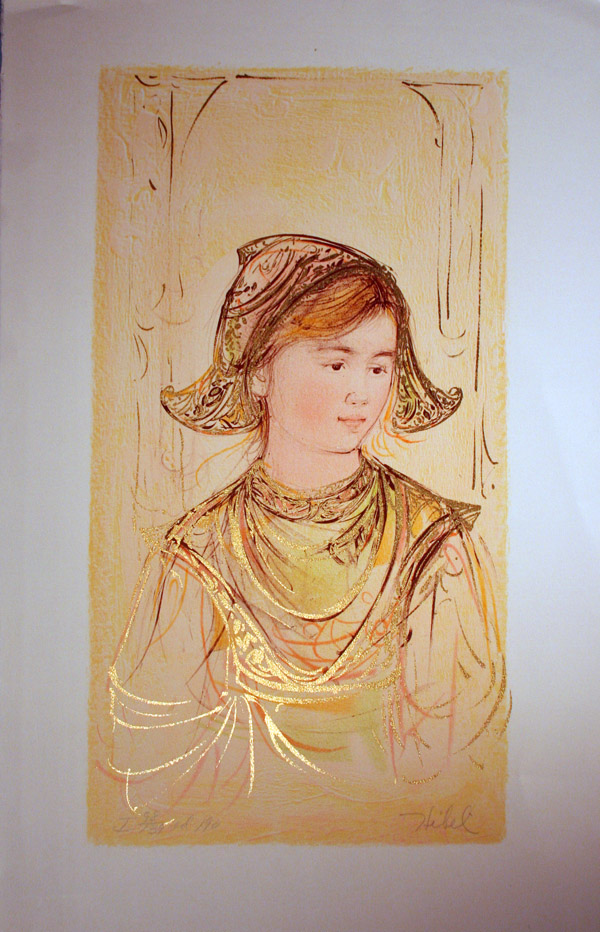 エドナ・ハイベル (Edna Hibel, 1917 - ) はアメリカの女流画家です。可憐な女性や子供を描いた作品は、ブラジル、ロシア、コスタリカ、中国の国立美術館を含め、欧米各地の美術館で展示されているほか、ハーヴァード大学、ボストン大学、デトロイト美術館 (the Detroit Institute of Arts, DIA) 等にも収蔵されています。