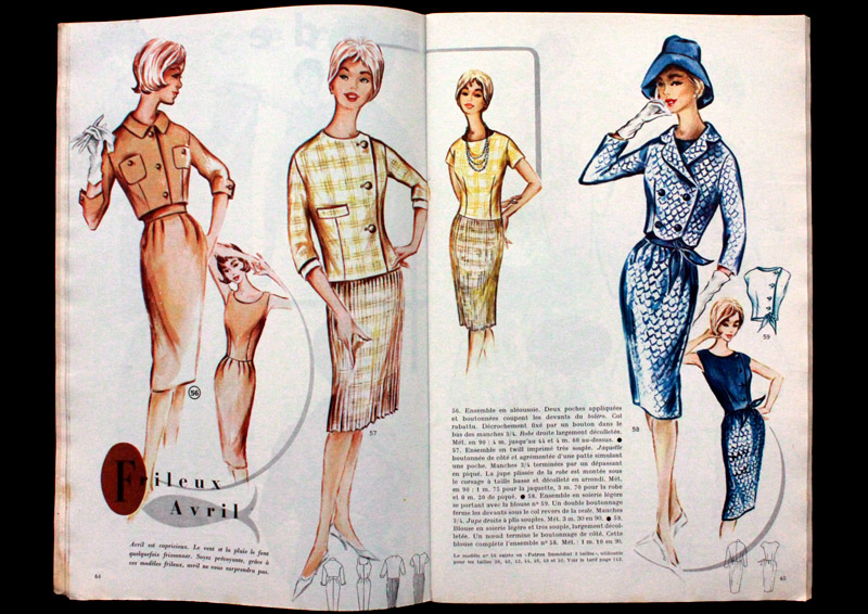 1961年4月号はパリの最新の流行が三枚の図版で取り上げられているほか、10歳か11歳になった子供が初めて聖体拝領を行う日のための子供服と付き添いの家族の服、春らしい刺繍などが特集されています。
