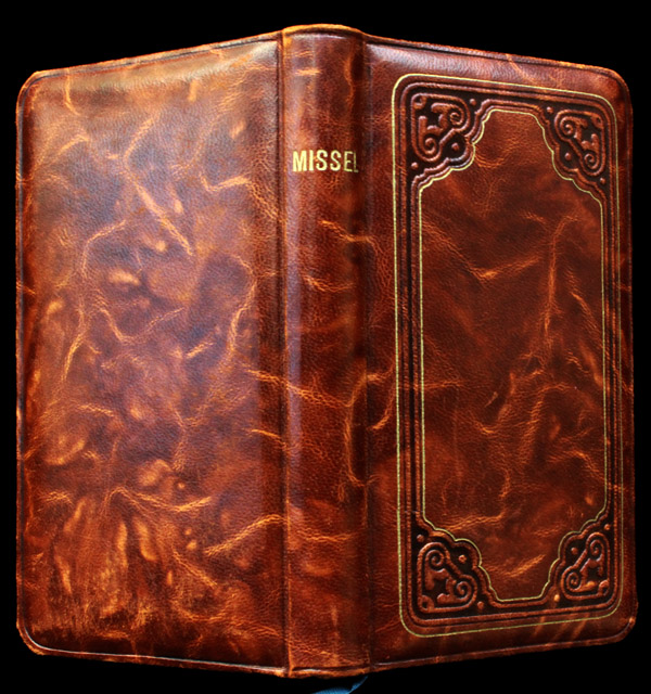 明るめの上品な色調のモロッコ革を表紙に使い、金線と型押しを施しています。見返しのデザインは、JHSと十字架のモノグラムを、日本の片輪車文あるいは青海波文を連想させるパターン上に連続して並べています。