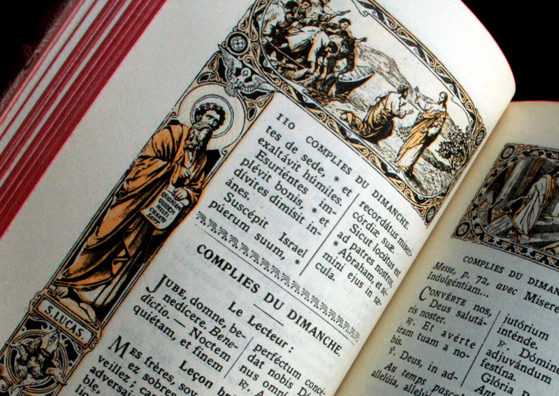 祈祷書本文はラテン語とフランス語で書かれ、四人の福音記者マタイ、マルコ、ルカ、ヨハネと、それぞれの福音記者を象徴するテトラモルフ(人間、ライオン、牛、鷲)、及びイエズスの公生涯の出来事(エルサレム入城、山上の垂訓、ペトロの召命、宮清め)を描いた絵に、各ページが囲われています。福音記者が持つ巻き物には、それぞれの福音書の冒頭部分がラテン語で記されています。