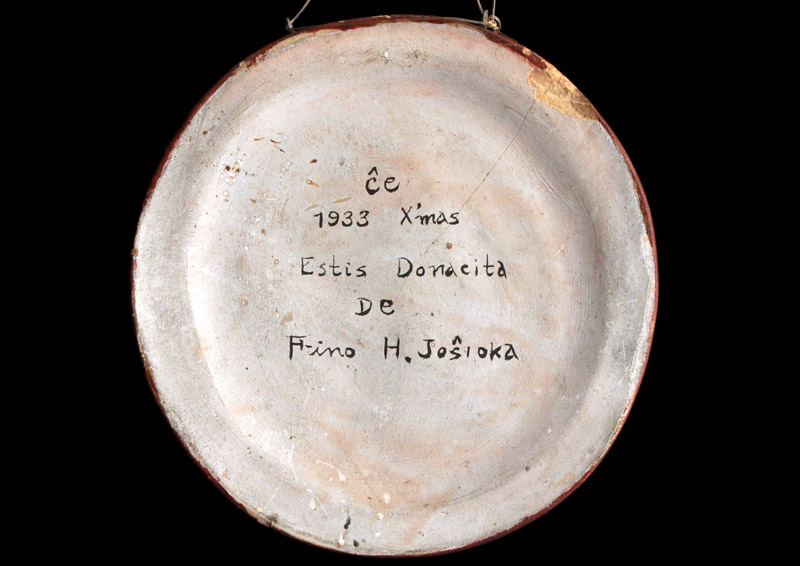この陶板がクリスマス・プレゼントとして贈られた 1933年は、ヒトラー内閣が成立し、国会議事堂放火事件が起こり、日本、次いでドイツが国際連盟を脱退した年です。この年のクリスマスにも人々は救い主の降誕を祝い、「天には栄光、地には善意の人に平和あれ」という歌声が響いたはずです。そのことを思うと、明るい未来を夢見るような子供の眼差しと、丁寧な字体のエスペラントによる裏面の書き込みが、観る者の感情を揺さぶります。