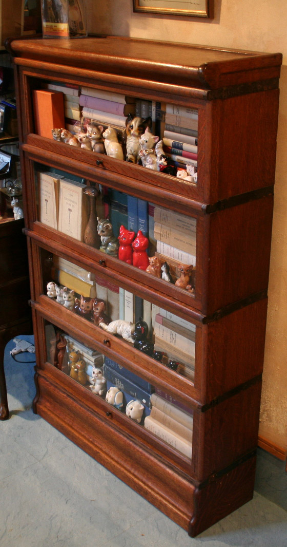 イギリス スタッキング・ブックケース 高さ 135cm 幅 88cm 奥行 27cm 下から順に、土台、4つの段、天板を重ねて載せたブックケース。6つの部分に分かれるので、たいへん容易に運搬できます。商品写真でいちばん上に置いている段のガラスがありません。私は気にせずそのまま使っています。 1920年頃 現状で 250,000円 戻る