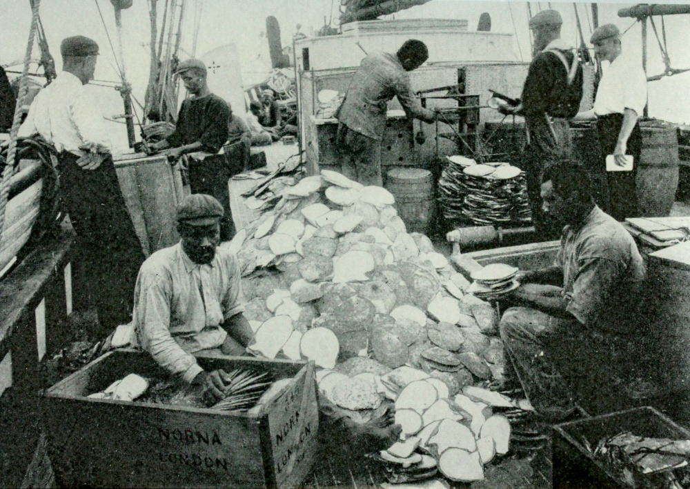 (上) ジョージ・フレデリック・クンツ「真珠の本」より、アラフラ海の船上で真珠を探す漁師たち