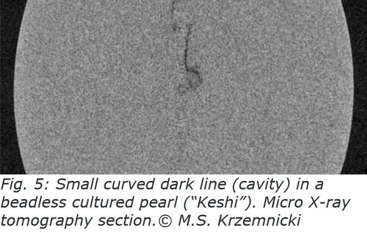 上のような断層写真は真珠が徐々に成長する過程を示すゆえに、天然真珠である証拠と誤解されることがあります。しかしながら外套膜内に形成される天然真珠は中心部から表層までが全く同質であり、中央部に厚く顕著なコンキオリンの層が写ることはありません。無核真珠の断層写真がこのように写れば、それは養殖真珠貝の生殖巣内で形成された芥子真珠であることを示します。
