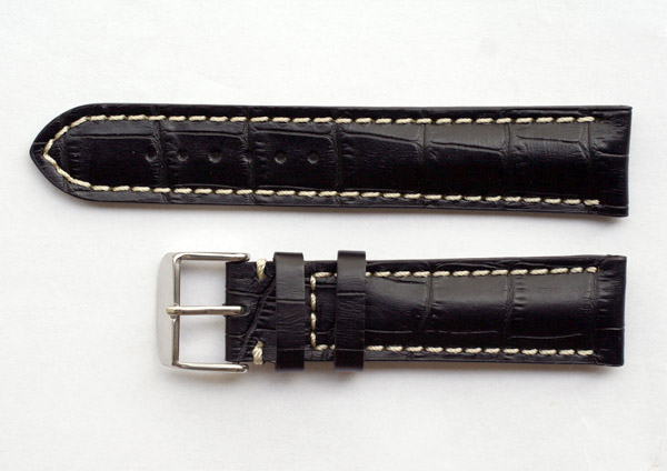 バネ棒式ラグ用高級バンド 22 mm 黒 クロコダイル型押し 艶消し仕上げ ドイツ製