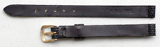 革製。現状では金色の尾錠が付いています。尾錠を除く長さはおおよそ 10cm + 6.5cm で、標準よりも多少短めです。
