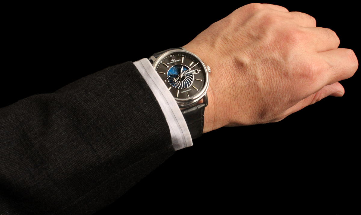 本品のケースは直径 40ミリメートル、厚さ 13ミリメートルと大きめのサイズです。文字盤の中央に星空が巡るデザインは重厚であるとともに、夜空の清々しさを感じさせます。