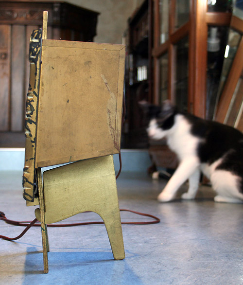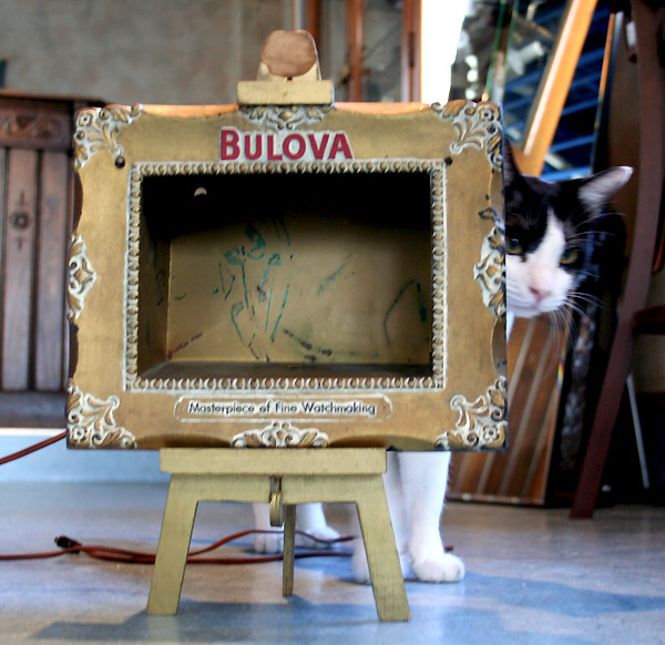 時計を前傾気味に展示できるようになっています。箱の内側にはおそらくベルベットが張ってあったはずです。張りなおせばいっそう高級感が出ます。昼間に見てもおもしろいデザインのディスプレイですが、夜に点灯すると時計に吸い込まれそうな幻想的な美しさを見せてくれます。