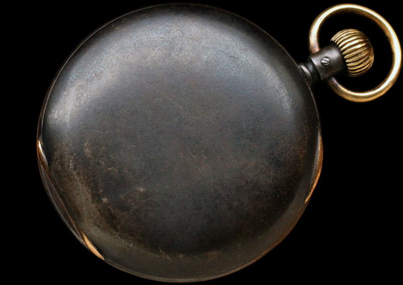 本品のケースは黒い鋼製です。蝶番やケースの歪み、ロックの不具合、錆等の問題は全く無く、たいへん良好な状態です。蓋の小窓の周囲には金張りを施したブロンズの枠が嵌め込まれ、四本のネジで裏側から留められています。金の枠と黒いローマ数字の取り合わせはたいへん高級感があるとともに、石造建築物の塔などにある大型のクロックにも似た重厚さを有します。