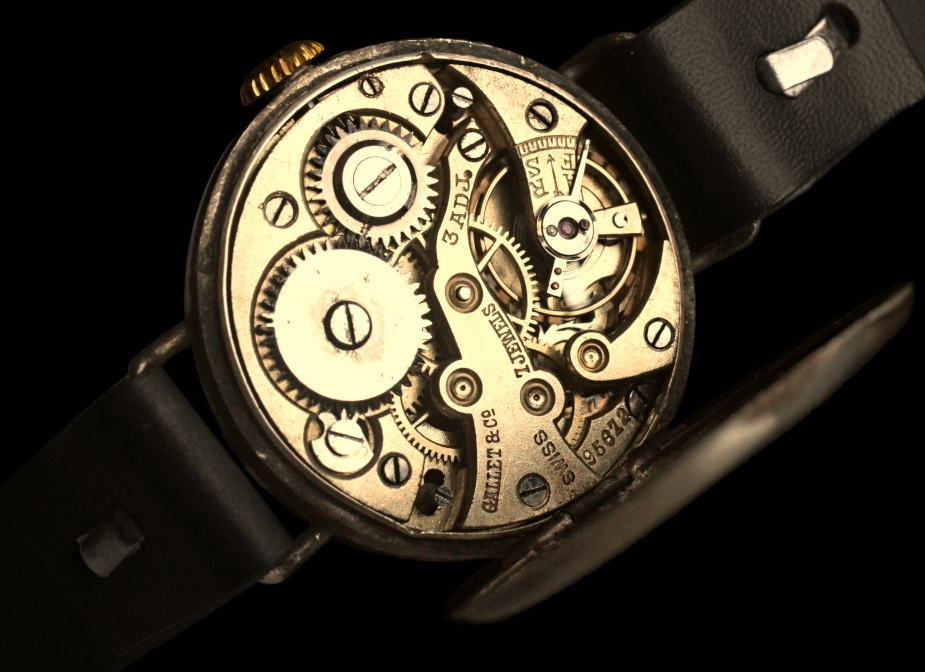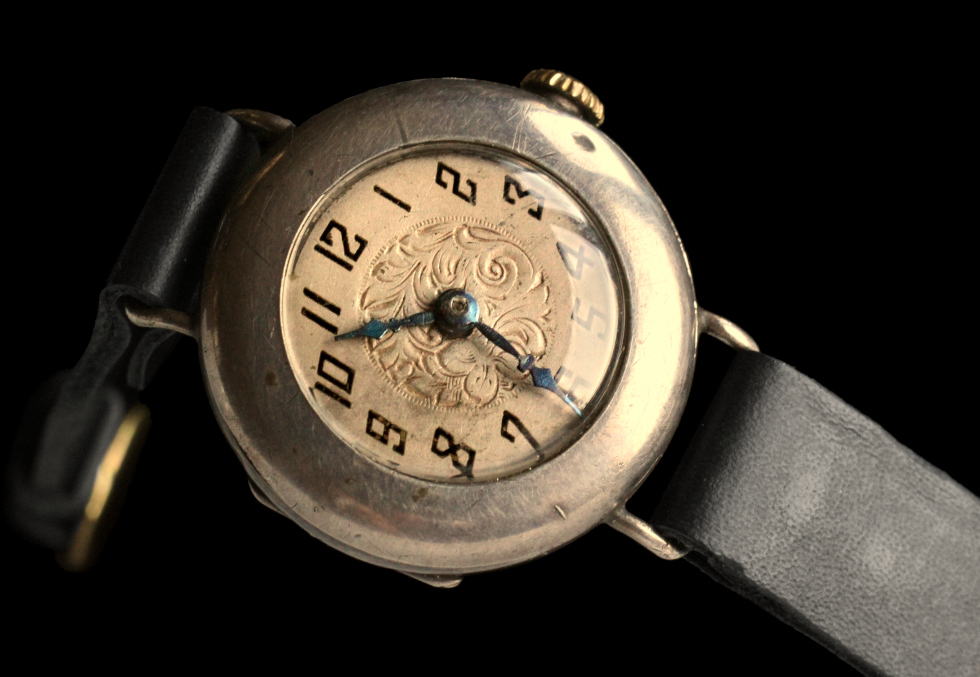 本品は上の写真と同時代に制作された腕時計です。一見して現代の時計と大きな違いは無いように見えますが、ケース(時計本体の外側)と機械の構造、インデックスや竜頭の意匠など、腕時計が誕生した時代の香りを随所にとどめており、バンドの取り付け方にも最初期の腕時計ならではの特徴が見られます。