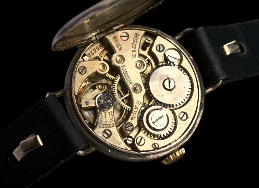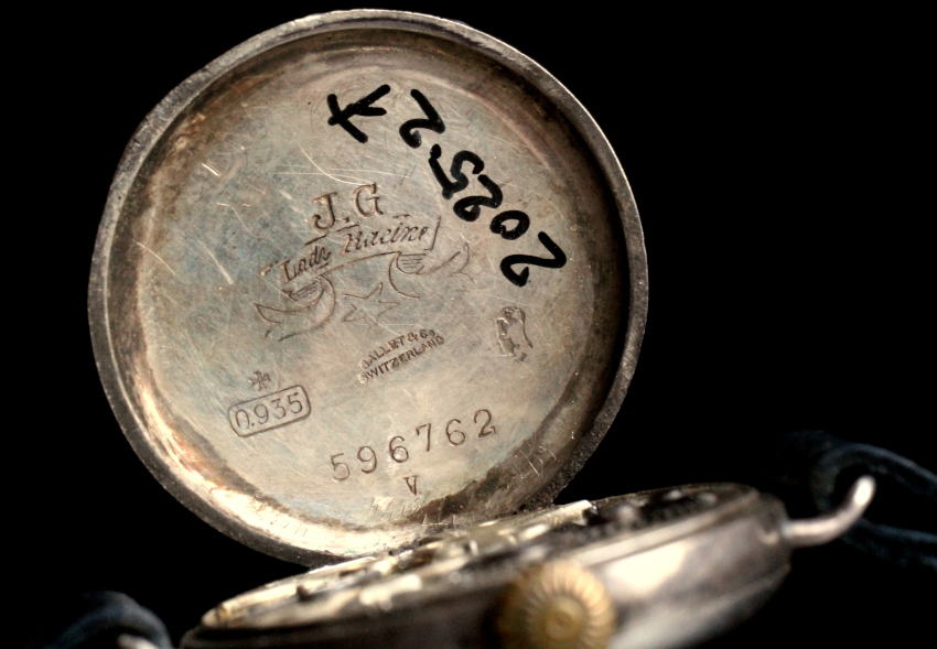 上の写真はケース蓋を開けて、その内側を撮影しています。蓋の内側にはメーカーのマーク、ケースのシリアル番号、純度 935パーミル(93.5パーセント)の銀を示すホールマーク、スイス、ギャレット時計会社(ガレ時計会社)の社名が打刻されています。銀は金、プラチナ、ステンレス・スティールと並んで化学変化を起こしにくく、アレルギーの原因にもならないので、時計ケースの素材として優れています。