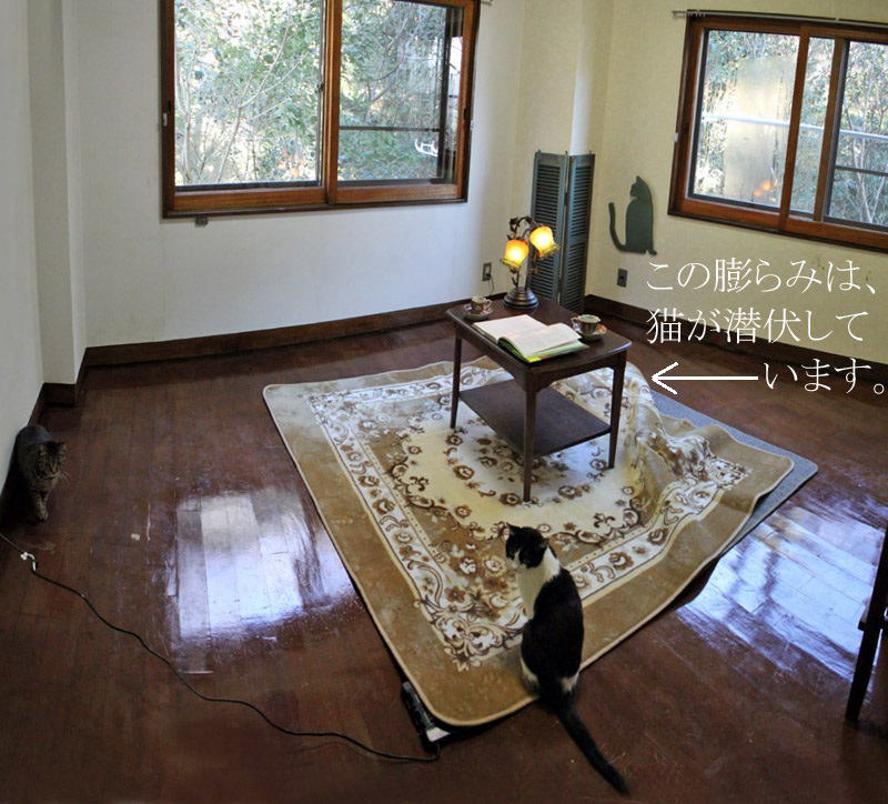 《ねこ室 神戸北野研究所》 には部屋が三つあります。アンティーク品売り場となっている大きな部屋、中ほどにある図書室、廊下の奥にある森の部屋です。どの部屋でも自由にお使いください。絨毯の上に寝転ぶと、にゃんこたちが体の上に乗ってきて、猫まみれになります。