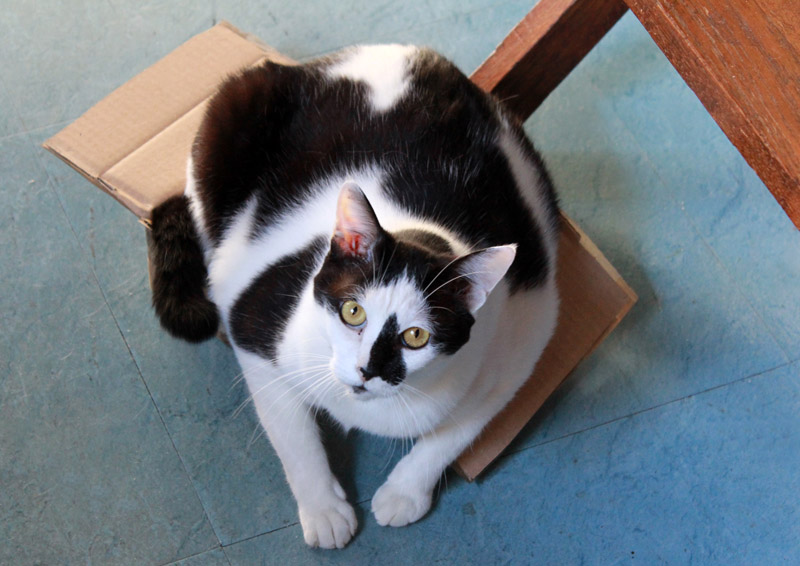 この小さな箱は捨てようと思って仮に売り場に置いたのですが、にゃんこが見つけて交替で入っています。好評なので捨てられません。いまはアンジェリカが入っています。