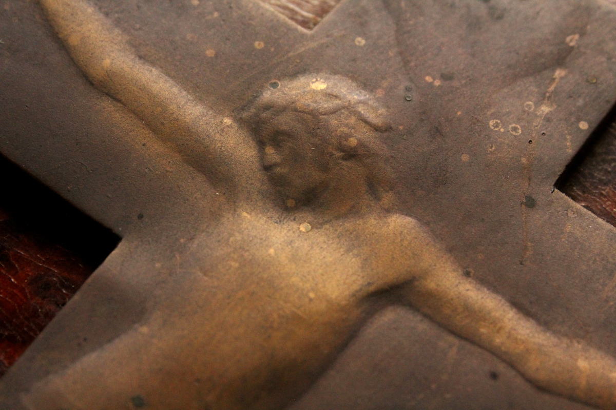 本品は高名なメダユール(仏 médailleur メダイユ彫刻家)であるオヴィド・ヤンセスの作品を中核に、ベル・エポック期のフランスで制作された宗教芸術の名品です。オヴィド・ヤンセスの手によるクルシフィクスは、見た目の美しさにおいても意味の深さにおいても、筆者が知る限り最も優れた作品です。均一のパティナ(古色)に覆われた本品クルシフィクスにおいて、幅広の十字架すなわち人間が犯す底知れない罪を背景に、救い主の優しき御姿は柔らかな愛の光に輝いています。
